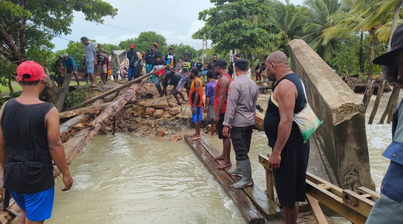 Papua – Kapolres Merauke, AKBP I Ketut Suarnaya, SH, SIK, melalui Kapolsek Onggaya, Iptu J. Sitanggang, dan anggotanya, bekerjasama dengan TNI dan warga setempat bergotong royong memperbaiki jembatan yang patah akibat cuaca ekstrem, (14/3/2024).