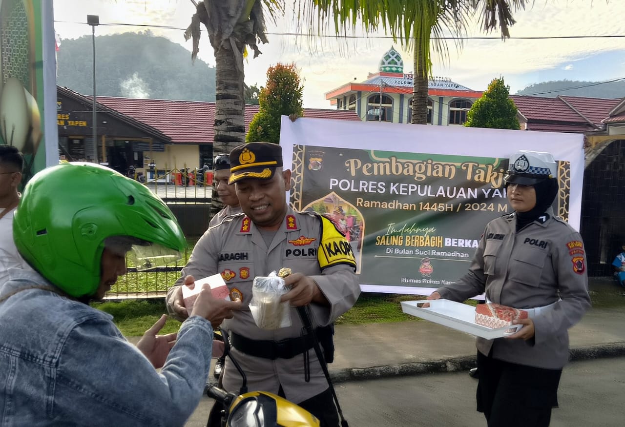 Papua – Menjelang waktu buka puasa, jajaran Polres Kepulauan Yapen melakukan berbagi takjil gratis kepada masyarakat, (21/3/2024).