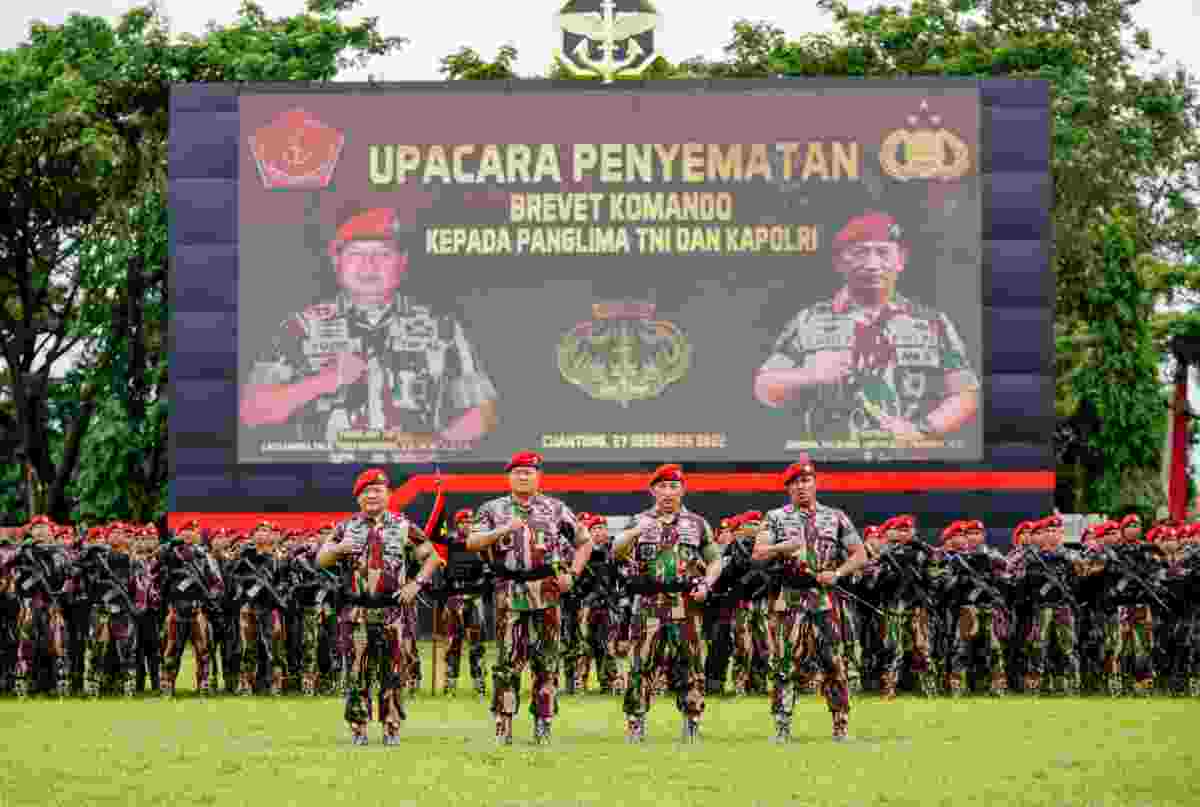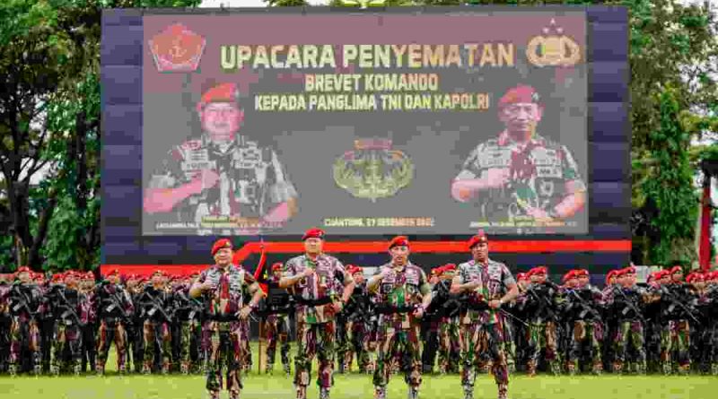 Jakarta – Kapolri Jenderal Listyo Sigit Prabowo dan Panglima TNI Laksamana Yudo Margono disematkan Baret Merah dan Brevet Komando dari pasukan elite Kopassus.