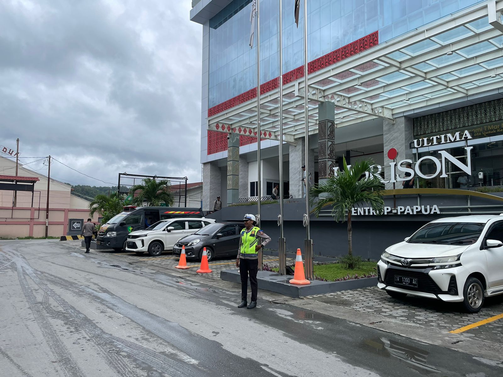 Papua – Untuk memastikan kelancaran arus lalu lintas pada pelaksanaan Rapat Pleno Terbuka Rekapitulasi Hasil Penghitungan Suara Pemilu 2024 tingkat Provinsi di Papua Satgas Kamseltibcarlantas Polda Papua lakukan Pengaturan Lalu Lintas (Gaturlalin) disekitar lokasi rapat pleno.
