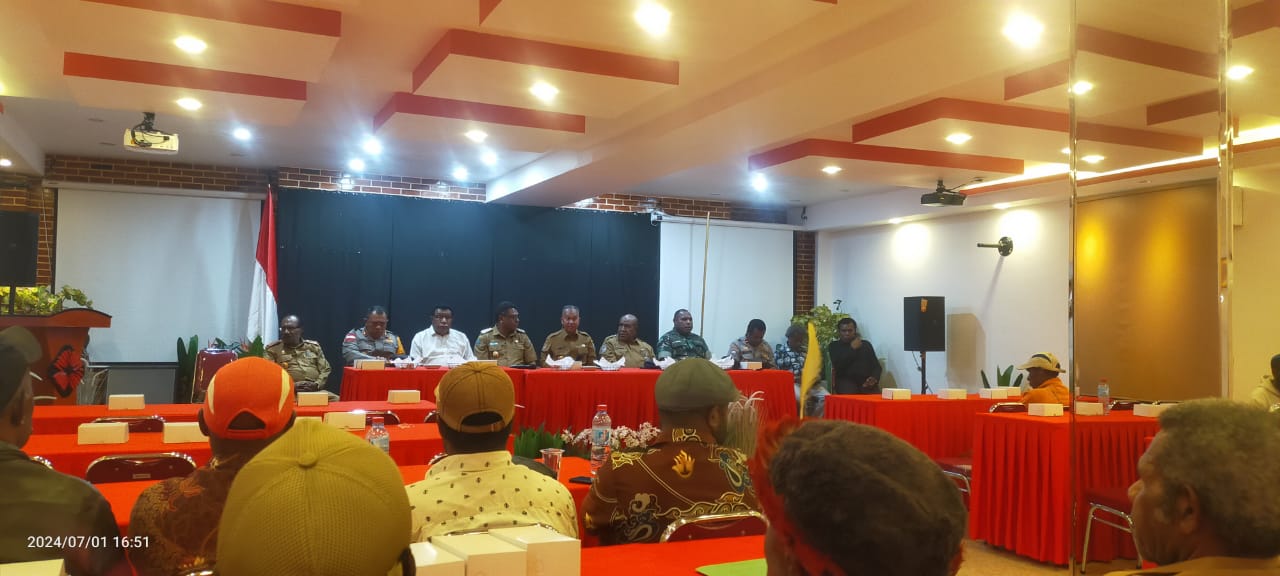Mediasi tersebut dilakukan pada Senin (01/07/2024) di Aula Lantai I, Hotel Grand Baliem. Pertemuan itu juga dihadiri langsung oleh Pj. Gubernur Papua Pegunungan, Dr.Velix Vernando Wanggai S.IP, M.A.P, bersama Sekda Provinsi Papua Pegunungan, Wasuok Siep, Pj. Bupati Jayawijaya Tony M. Mayor, Sekda Lanny Jaya Petrus Wakerkwa, ketua MRP Provinsi Papua Pegunungan Agus Nikil Huby, Dandim 1702 Jayawijaya, Letkol Pnb Athenius Murip, Kabag Ops Polres Jayawijaya, AKP Soeparmanto, S.H, Theo Hesegem selaku mediator dan sejumlah tokoh penting lainnya.