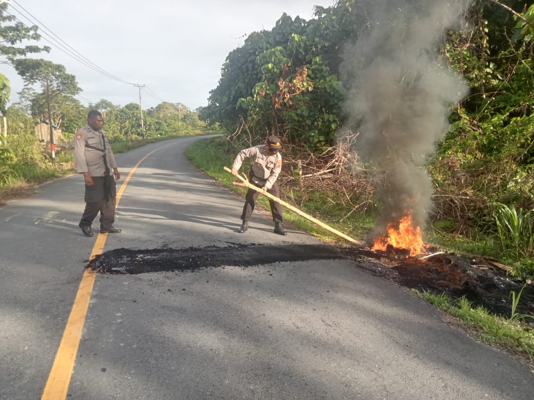 “Pukul 06:50 eit kami bersama anggota piket polsek darmi kota dengan menggunakan mobil patroli, tiba di TKP dimaksud tepatnya di pertigaan antara kampung sewan dan waskey, namun tidak mendapati oknum masyarakat yang sengaja melakukan hal tersebut kemudian kami langsung menyingkirkan 1 ban mobil yang dibakar dan 1 batang pohon yang dijatuhkan ke tengah jalan raya dan beberapa dahan pohon yang diletakkan di tengah jalan raya pertigaan kampung sewan dan waskey hingga tanjung batu sepanjang kurang lebih 50 meter,” ujar iptu arie widjaya