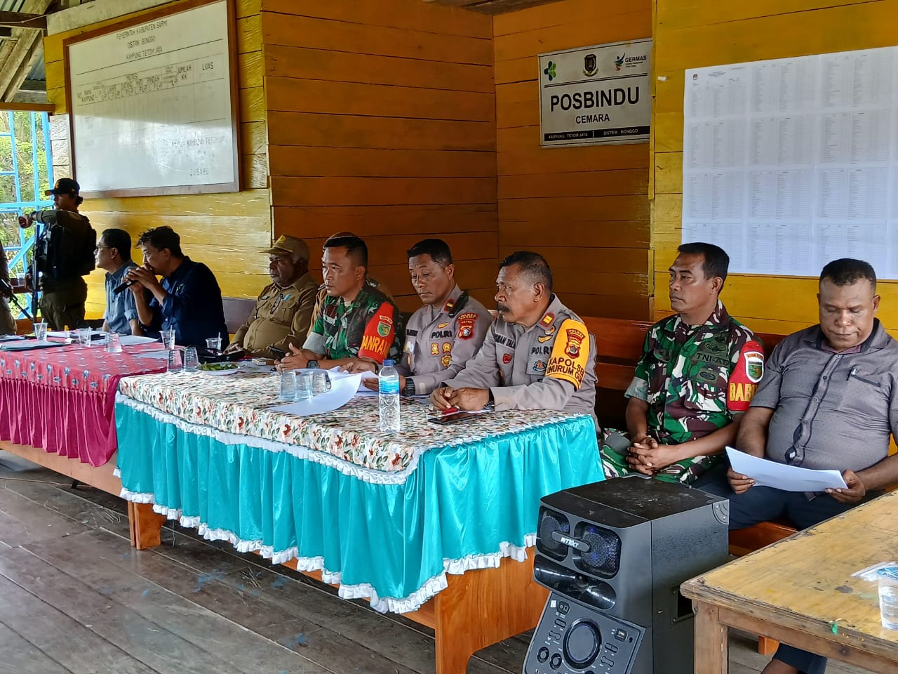 Sarmi – Bertempat di Balai Kampung Tetom Jaya SP 3 Dist Bonggo personil Polsek Bonggo bersama personil Koramil yang di pimpin Kapolsek Bonggo IPDA Yustus Maudul, S.E., M.Si laksanakan pengamanan kegiatan Rekapitulasi Perhitungan Pembayaran Kompensasi Hak Ulayat oleh PT.Wapoga Mutiara Timber Unit II Camp Karang dan PT. Salaki Mandiri Sejahtera Periode bulan Januari – Juni 2024 kepada para pemilik Hak Ulayat. Senin (7/10/2024)